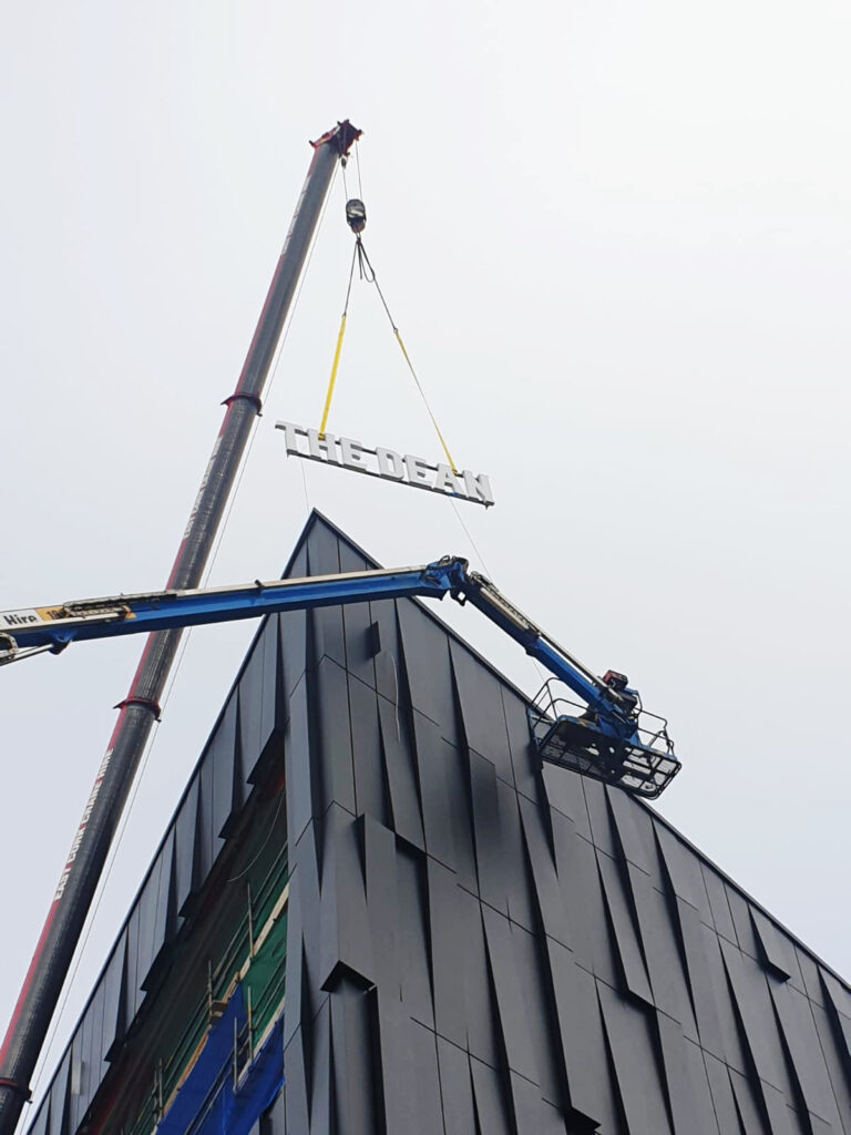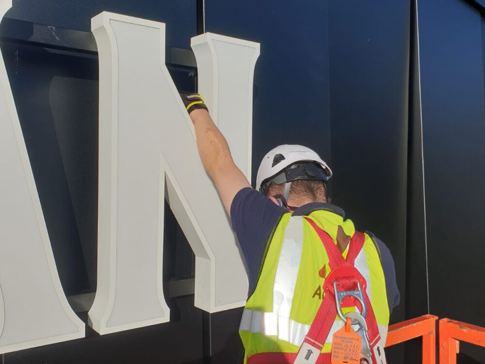 We are experienced and equipped to work at height, installing large scale external signage and installations on multi-storey buildings, along with all internal wayfinding signage, vinyl decals, and brand installations.